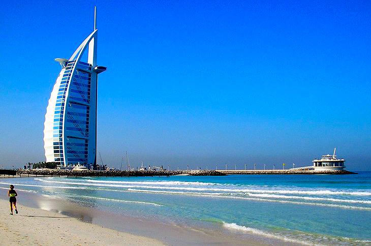 The Burj Al-Arab is the world's tallest hotel, standing 321 meters high on its own artificial island on the Dubai coastline.